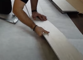 1. Ламинат SPC начинают монтировать от угла помещения, прижав первую плитку к брусочкам, регулирующим размер зазора;