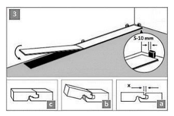 - первая плитка второго ряда соединяется с предыдущим рядом по длинной стороне, а вторая плитка во втором ряду соединяется с первой короткой стороной так, чтобы шип на ее длинной стороне лег в паз длинного шипа плитки верхнего ряда. Затем, подняв на 15 – 300 обе плитки, они сдвигаются вверх до защелкивания замка. Таким образом соединяются остальные элементы покрытия;