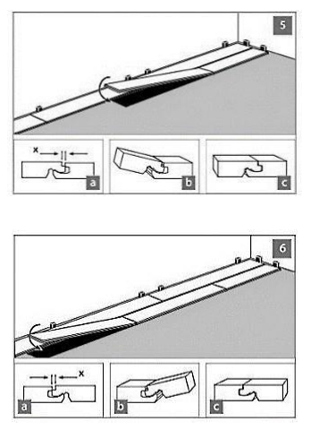 - каждый ряд стыкуется торцами по отдельности, а затем выполняется совмещение длинного замка по всей длине соседних рядов.