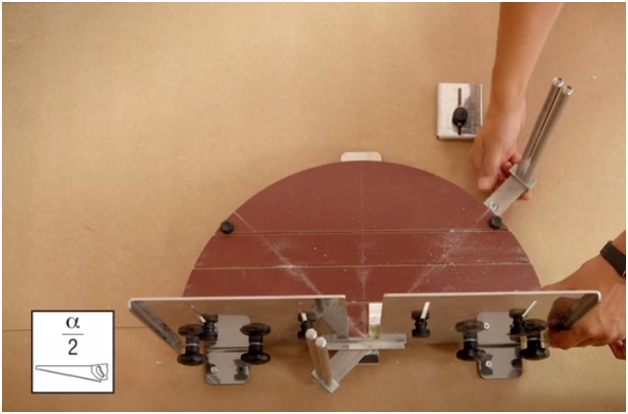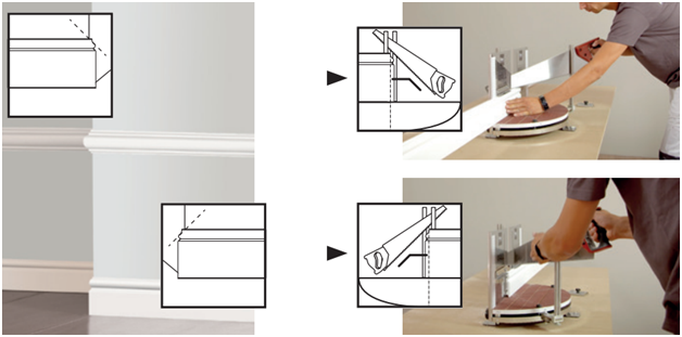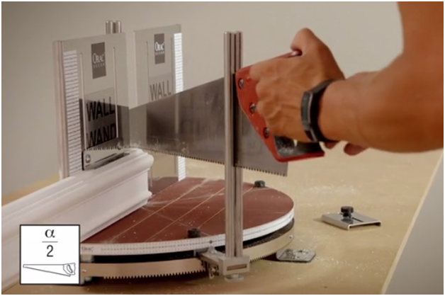 Отпиливаем плинтус Orac (молдинг, карниз) под углом α, деленное на два.