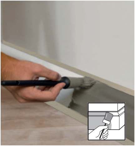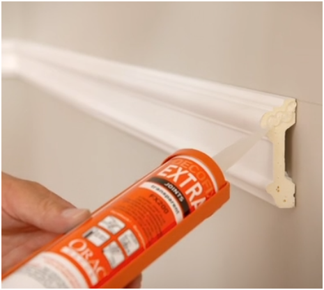 Наносим на плинтус, молдинг или карниз Orac монтажный клей. Компания Orac Decor рекомендует клей DecorFix Pro для пористых поверхностей внутри помещений и DecorFix Power для тяжелых профилей, гладких или влажных поверхностей, при наружных работах.
