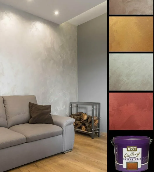 База серебристо-белая колеруется пастами VGT. Базовые цвета колеровки могут использоваться как самостоятельное покрытие или смешиваться для создания уникальных оттенков. Для экономии материала и усиления декоративного эффекта рекомендуется предварительно окрасить поверхность краской-подложкой в цвет финишного покрытия.