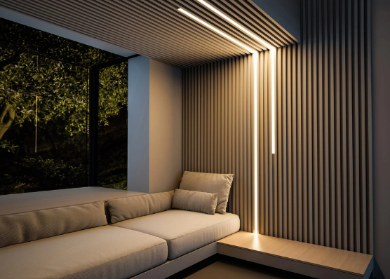 Связываем со светом. Отличным вариантом станет совмещение реечной конструкции потолка или стен и светодиодного освещения.