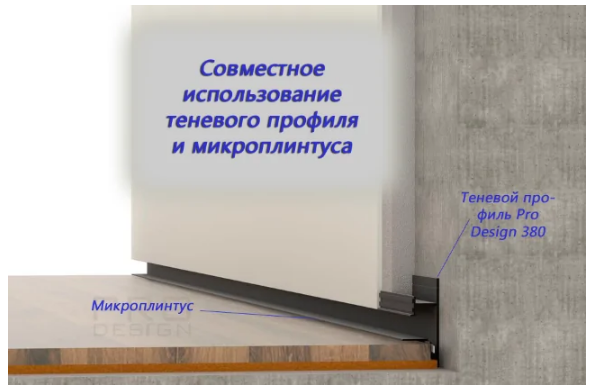 Сочетается с теневым профилем Pro Design 380. В этом случае становится возможным создание эффекта парящей стены.