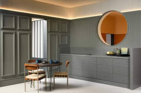 Потолочные карнизы устанавливаются на пересечении стены и потолка, создавая гармоничное переходное пространство. Для соединения отделки стен с отделкой потолка можно использовать осветительные элементы. Например, светодиодная подсветка может быть установлена внутри реечных панелей или за карнизами, создавая эффектную игру света и тени.
