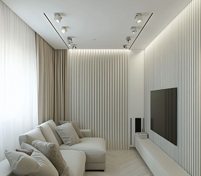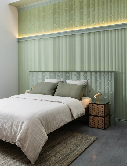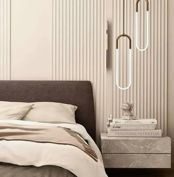 Оформите зону за кроватью с помощью 3D панелей. Это придаст вашей спальне уют и индивидуальность. Панели можно разместить горизонтально за кроватью и вертикально у тумбочек, создавая единую гармоничную композицию.