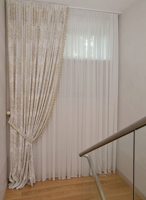 Оформление окна станет более эффектным при сочетании декоративных портьер с множеством каскадов и драпировки, и рулонных занавесей, которые нетрудно опускать или поднимать. Многоярусные ламбрекены также украсят композицию.