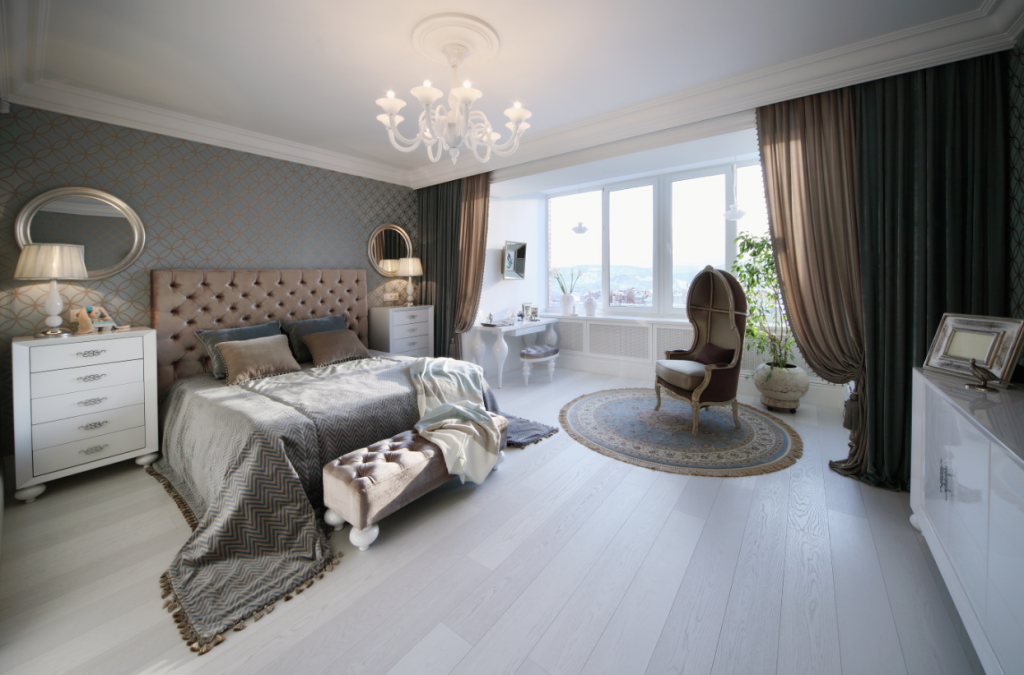 Очень удобно использовать симметрию при оформлении панорамных окон. Здесь портьеры подчеркнут интерьерный стиль, не спрячут окна и простор за ними. В комнатах с двумя и более окнами симметрия поможет выделить особенности пространства и сделать дизайн лаконичным.