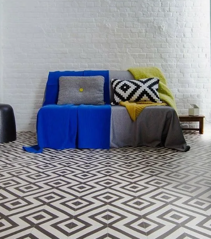 Для тех, кому чужд строгий минимализм, в тренд вошли напольные покрытия с динамичными геометрическими рисунками.