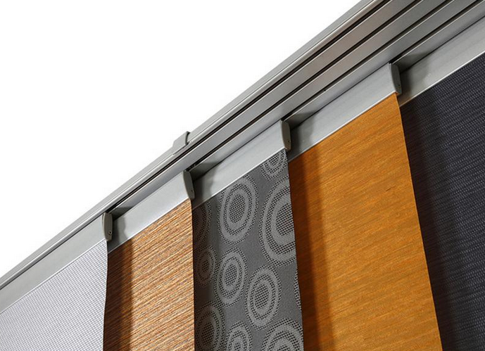 Карнизы для японских штор — сложные конструкции, с помощью которых плотно натянутые шторы можно перемещать по горизонтали, составить друг за другом, поменять местами — и все это, не снимая. Навес штор при помощи клейкой ленты и бегунков в нескольких канавках. Изготавливаются из пластика и металла с ручным и автоматическим управлением посредством пульта.