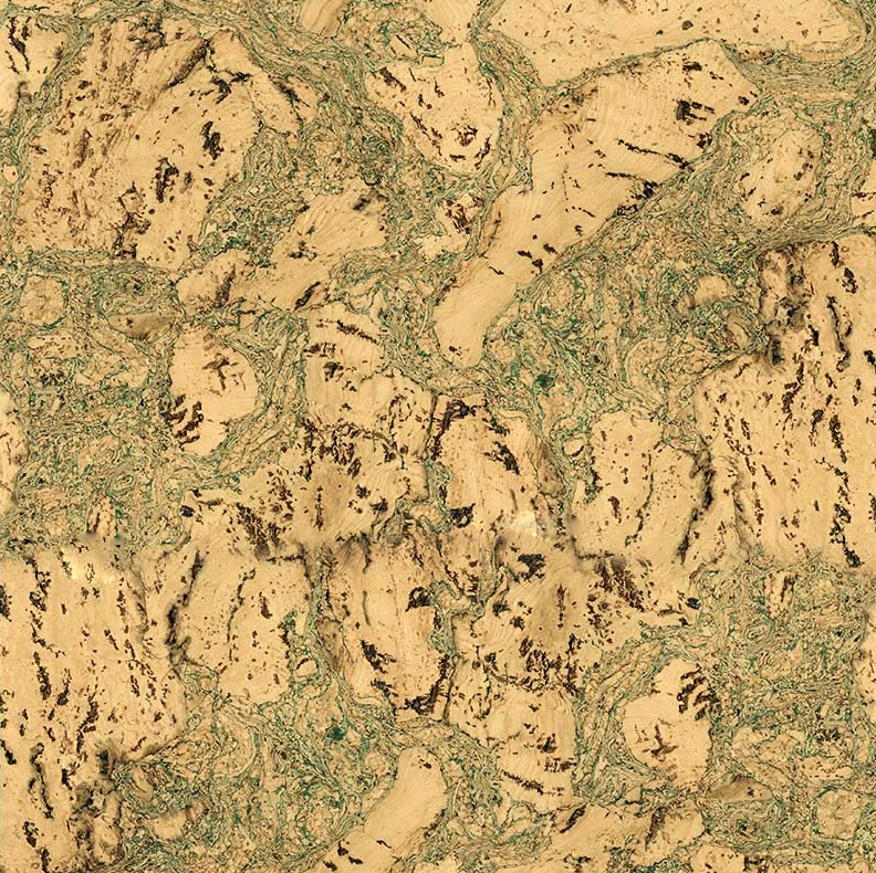 Пробковые панели Ibercork Авила верде с крупными кусками пробковой коры на зеленовато-коричневом фоне. Эта пробка привносит в помещение уют, акустический комфорт и отлично сочетается с большинством стилей — от эко до современной классики.