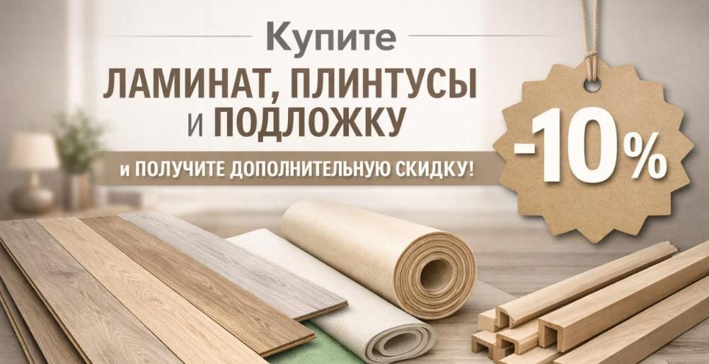 При покупке в одном заказе ламината / замкового кварцвинила + подходящей подложки + плинтусов дарим дополнительную скидку 10%!